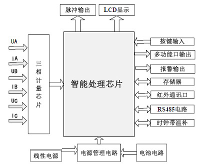 電能表工作時,電壓、電流經(jīng)取樣電路分別取樣后,送至放大電路緩沖放大,再由計量芯片轉(zhuǎn)換為數(shù)字信號,高性能微控制器負責對數(shù)據(jù)進行分析處理。由于采用高精度計量芯片,計量芯片自行完成前端高速采樣,計量算法穩(wěn)定,微控制器僅需要管理和控制計量芯片的工作狀態(tài)。圖中的微控制器還用于分時計費和處理各種輸入輸出數(shù)據(jù),并根據(jù)預(yù)先設(shè)定的時段完成分時有、無功電能計量和最大需量計量功能,根據(jù)需要顯示各項數(shù)據(jù)、通過紅外或485接口進行通訊傳輸,并完成運行參數(shù)的監(jiān)測,記錄存儲各種數(shù)據(jù)。